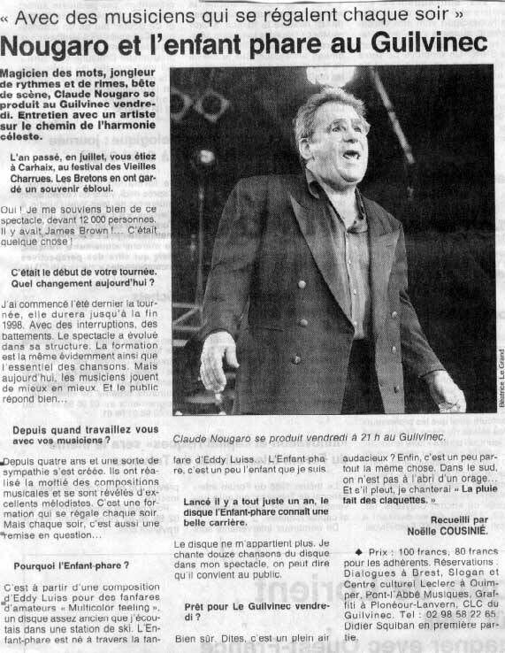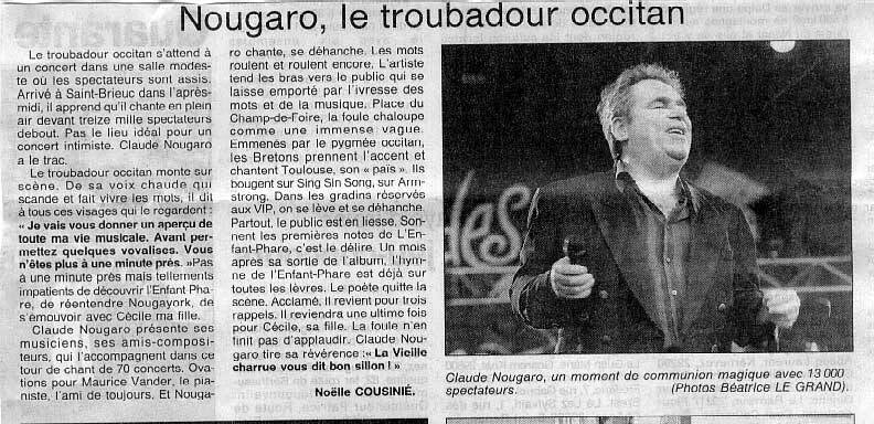 La Note bleue. En ce moment, ma priorité est de terminer mon disque. Je ne pense qu'à ça. Tout le temps. Même lorsque je vais me reposer à la campagne, dans les Corbières, autour de la rivière, des cigales, du vent... un lieu d'où émane une certaine sérénité. Lorsque je vais là-bas, je me repose et je décide, moi qui suis plutôt un Nougarat des villes, de devenir un Nougaro des champs, parce que le pays me plaît, me parle...